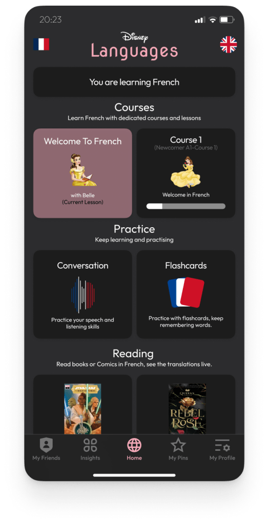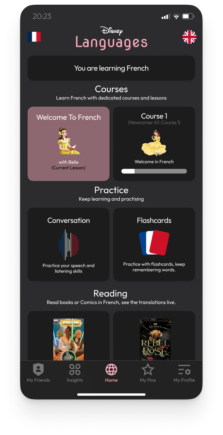 For the learning section I thought about apps I have used, Duolingo, Lingvist and Babbel. Making the learning fun and interactive seems a good way to go. Having the main bulk of learning in Courses, allowing you to practice speaking, listening and remembering words under Practicing. Having the reading section of Disney based books tapping into their wide selection of books.